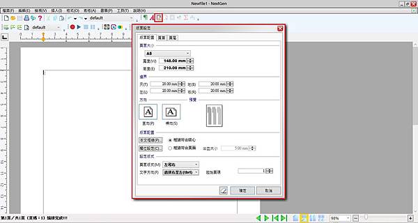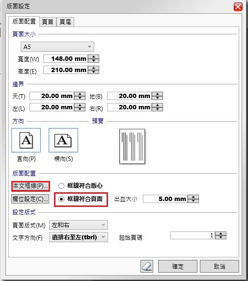 大部分排版小說用的是A5,所以示範這裡是用A5,它會自己調好版面大小,至於下方的文字方向請選擇書想編排的是直式或橫式。