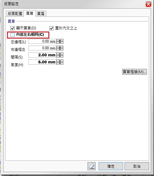 先勾選顯示頁首(頁尾也是),調整和內文的間隔要多少,和頁首的框框要多大。